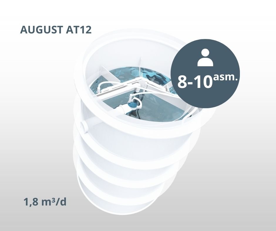 AUGUST AT12 – galingas ir patikimas biologinis nuotekų valymo įrenginys, skirtas vidutiniams ir didesniems namų ūkiams bei komerciniams objektams, kuriuose gyvena ar dirba iki 12 gyventojų ekvivalentų. Įrenginys pasižymi aukštu valymo efektyvumu, ilgaamžiškumu ir galimybe užtikrinti aplinkosaugos reikalavimų laikymąsi net intensyviai eksploatuojant.